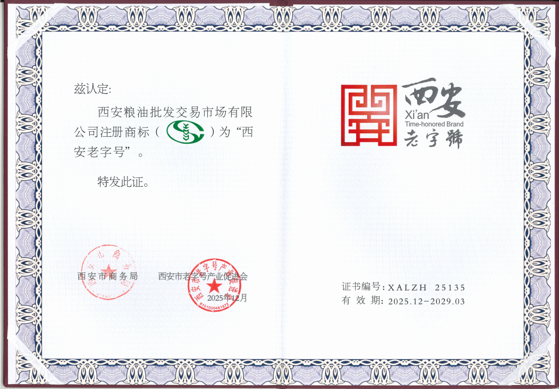 近日,西安市商務(wù)局正式公布第三批“西安老字號”認(rèn)定名單,西安糧油批發(fā)交易市場憑借深厚的文化積淀和卓越的行業(yè)影響力,成功入選,被授予“西安老字號”榮譽稱號。這一殊榮不僅是對市場三十年來堅守品質(zhì)、服務(wù)民生的充分肯定,也標(biāo)志著其品牌價值與文化內(nèi)涵邁上了新臺階。